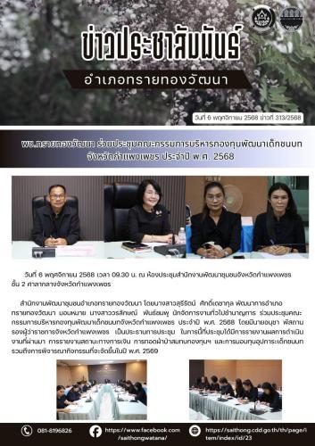 สำนักงานพัฒนาชุมชนอำเภอทรายทองวัฒนา โดยนางสาวสุรีรัตน์ ศักดิ์เดชากุล พัฒนาการอำเภอทรายทองวัฒนา มอบหมาย นางสาววรลักษณ์ พันธ์ชมพู นักจัดการงานทั่วไปชำนาญการ ร่วมประชุมคณะกรรมการบริหารกองทุนพัฒนาเด็กชนบทจังหวัดกำแพงเพชร ประจำปี พ.ศ. 2568 โดยมีนายอนุชา พัสถาน รองผู้ว่าราชการจังหวัดกำแพงเพชร เป็นประธานการประชุม ในการนี้ที่ประชุมได้มีการรายงานผลการดำเนินงานที่ผ่านมา การรายงานสถานะทางการเงิน การทอดผ้าป่าสมทบกองทุนฯ และการมอบทุนอุปการะเด็กชนบท รวมถึงการพิจารณากิจกรรมที่จะจัดขึ้นในปี พ.ศ. 2569