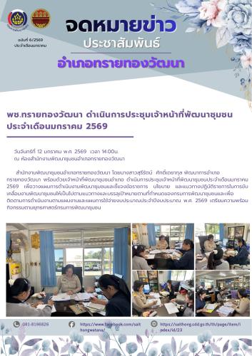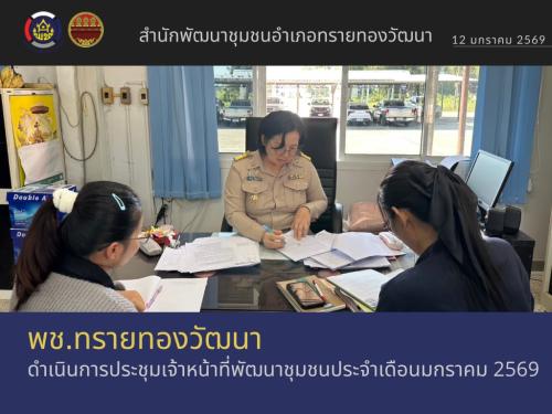 สำนักงานพัฒนาชุมชนอำเภอทรายทองวัฒนา โดยนางสาวสุรีรัตน์ ศักดิ์เดชากุล พัฒนาการอำเภอทรายทองวัฒนา พร้อมด้วยเจ้าหน้าที่พัฒนาชุมชนอำเภอ ดำเนินการประชุมเจ้าหน้าที่พัฒนาชุมชน ประจำเดือนมกราคม 2569 เพื่อวางแผนการดำเนินงานพัฒนาชุมชนและชี้แจงข้อราชการ นโยบาย และแนวทางปฏิบัติราชการในการขับเคลื่อนงานพัฒนาชุมชนให้เป็นไปตามแนวทางและบรรลุเป้าหมายตามที่กำหนดของกรมการพัฒนาชุมชน และเพื่อติดตามการดำเนินงานตามแผนงานและแผนการใช้จ่ายงบประมาณประจำปีงบประมาณ พ.ศ. 2569 เตรียมความพร้อมกิจกรรมตามยุทธศาสตร์กรมการพัฒนาชุมชน